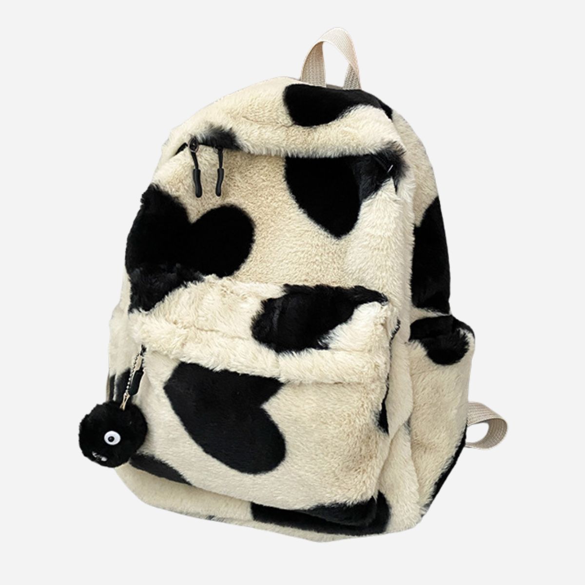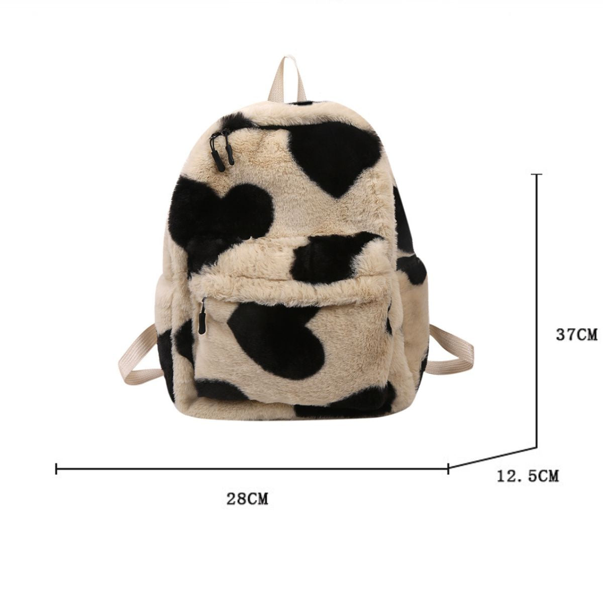 Deze superzachte rugzak is niet alleen heerlijk om naar te kijken, maar ook om te dragen! Met zijn fluffy vachtje en speelse zwarte hartjesprint op een warme crèmekleurige achtergrond is dit de perfecte tas voor wie dol is op stijl én comfort.