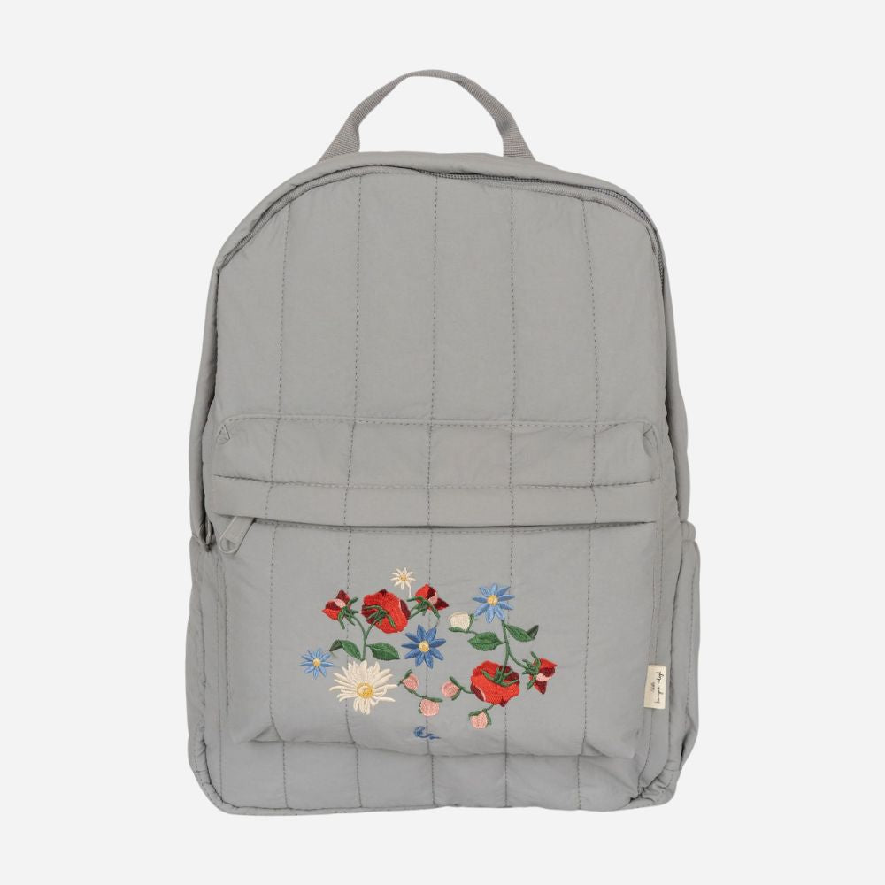 Deze lichtgrijze rugzak straalt rust en natuur uit, met een elegante geborduurde bloemenkrans op de voorzijde. Perfect voor kinderen die houden van bloemen, zachte kleuren en een tikkeltje romantiek. Een stijlvolle metgezel voor elke schooldag of avontuur buiten.
