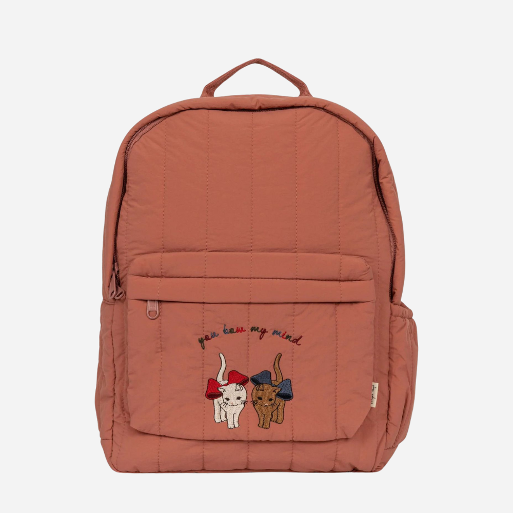 Deze stijlvolle rugzak combineert een warme terra kleur met een vrolijk design van twee dierenvriendjes met strik. De speelse geborduurde tekst “you bow my mind” maakt deze tas uniek en vol karakter. Een perfecte mix van stijl en speelsheid!