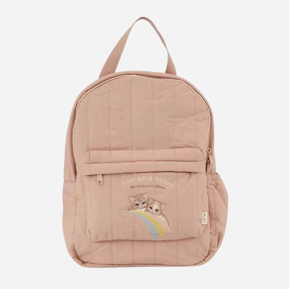 Deze schattige rugzak is perfect voor jonge avonturiers of liefhebbers van alles wat zacht en gezellig is. De subtiele poederroze kleur, het geborduurde regenboogmotief en de knuffelige katjes zorgen voor een onweerstaanbare look. Praktisch en stijlvol tegelijk!