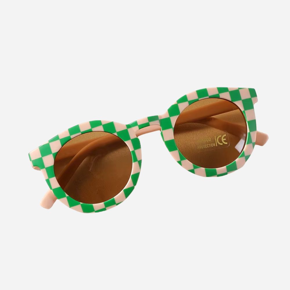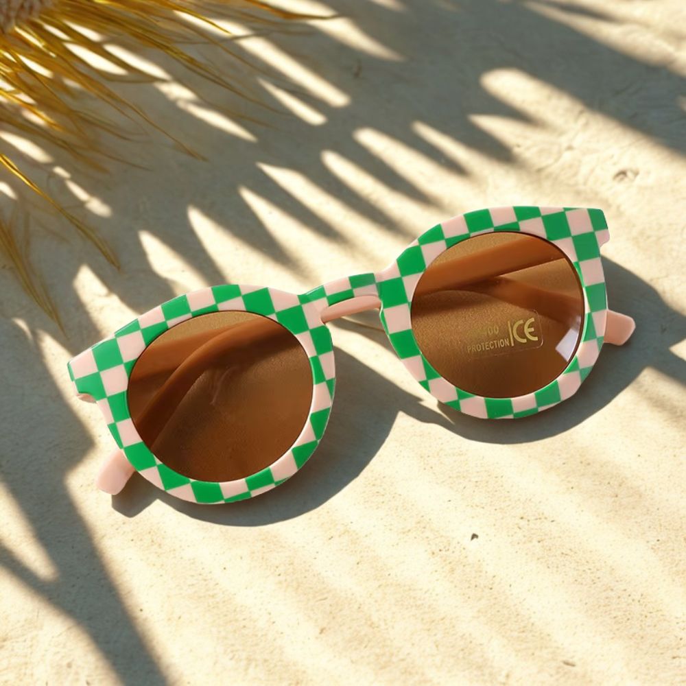 Fris, stoer en vrolijk! Deze zonnebril met een groen-wit schaakbordmotief is perfect voor energieke kinderen die klaar zijn voor elk avontuur onder de zon.