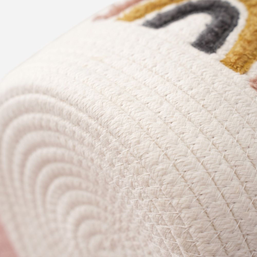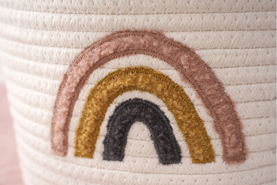 Deze stijlvolle opbergmand van 100% zacht katoen is niet alleen praktisch, maar ook een echte eyecatcher in elke ruimte. Het speelse regenboogmotief zorgt voor een warme, gezellige uitstraling – perfect voor de kinderkamer, woonkamer of badkamer. Met een hoogte van 25 cm en een diameter van 20 cm is deze mand ideaal voor het opbergen van speelgoed, boeken of kleine accessoires. Dankzij de stevige handvatten is hij eenvoudig te verplaatsen.