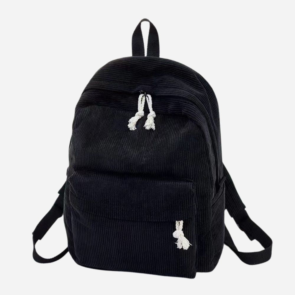 Deze zwarte ribcord rugzak combineert tijdloze stijl met praktisch gebruik. Perfect voor dagelijks gebruik en avonturen.